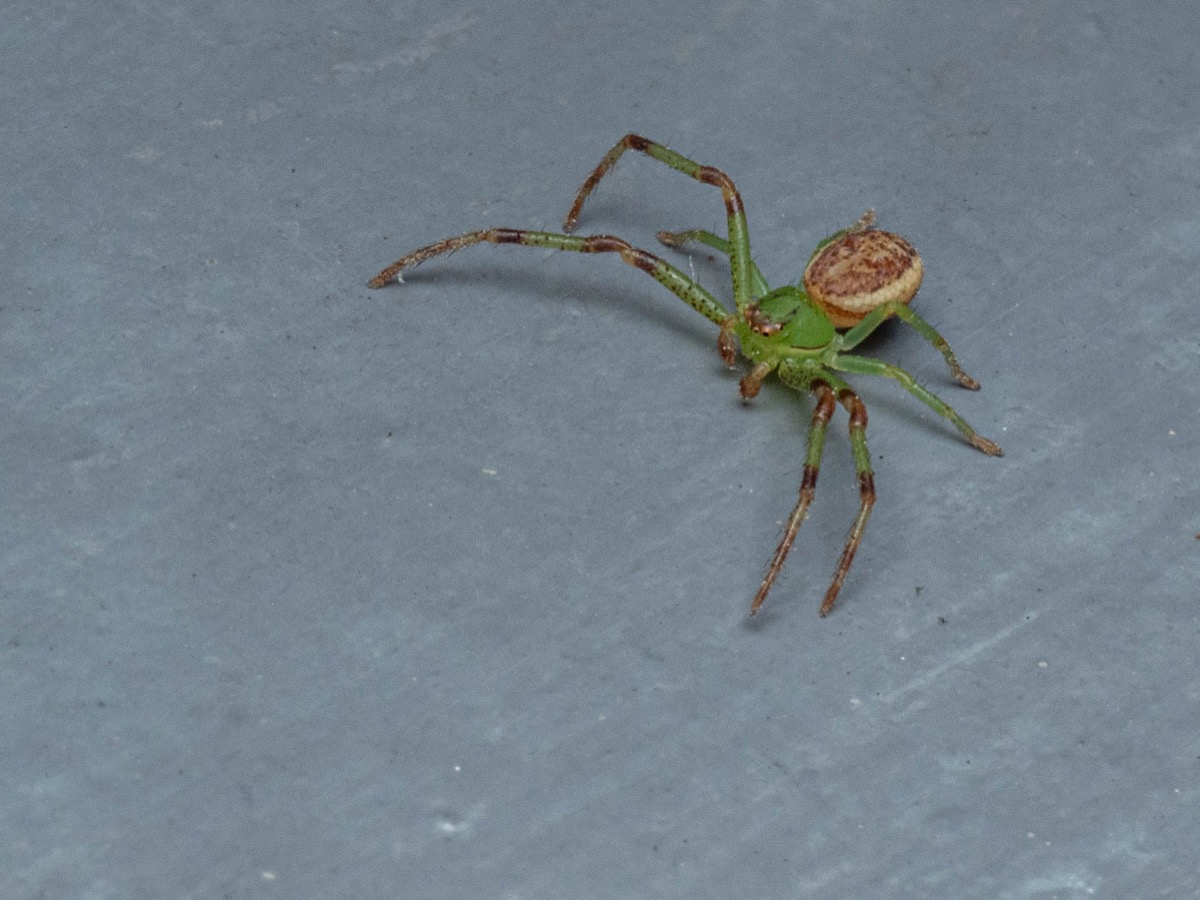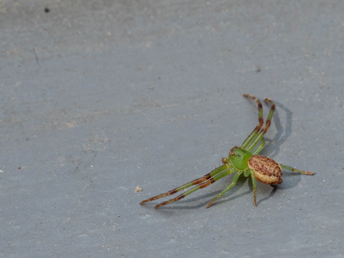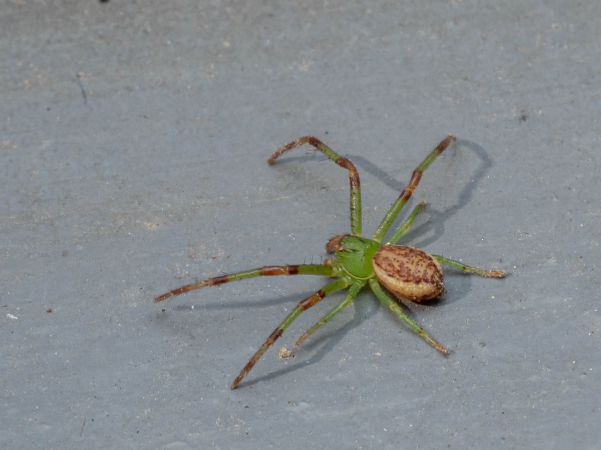 Die Weibchen haben grüne Beine und einen grünen Cephalothorax mit großem braunem Fleck auf dem Abdomen. Die Männchen haben bräunlich geringelte Beine. Der Körper kann bräunlich sein.