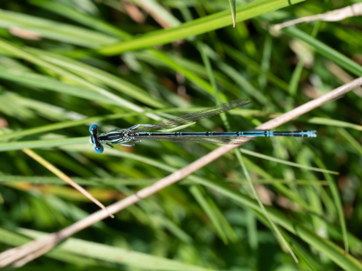 - Platycnemis pennipes: blassblau bis grau, Männchen mit deutlich verbreiterten, weißen Schienen