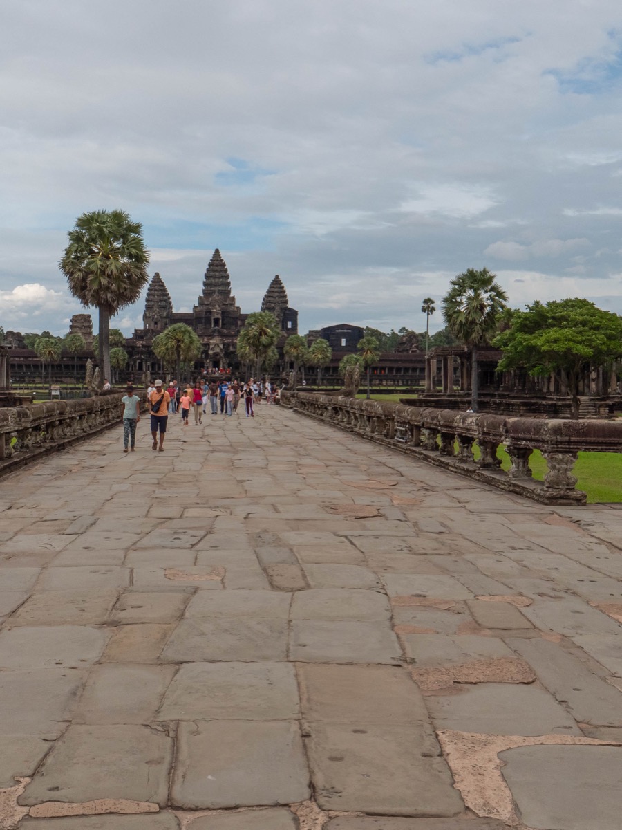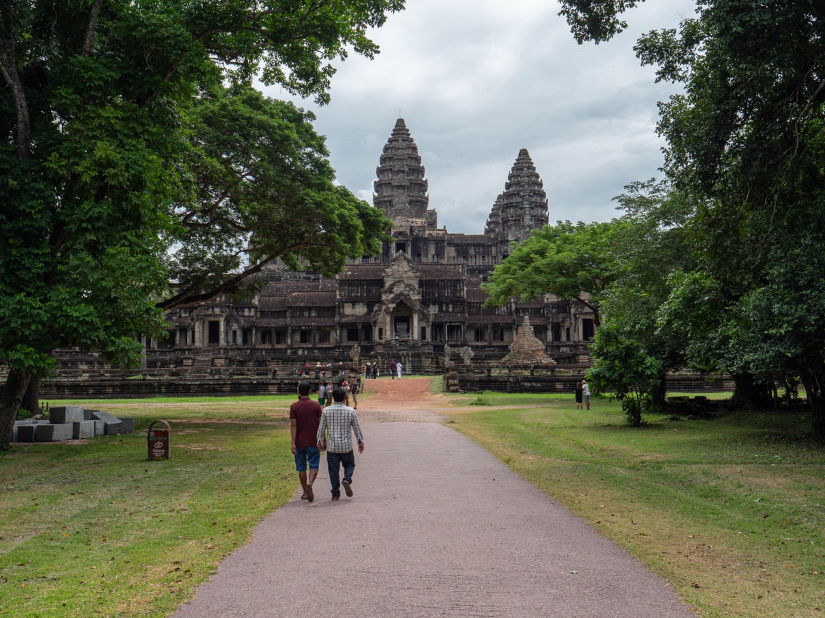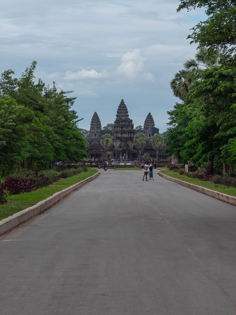 Nous avons entamé la visite du temple d’Angkor Vat par l’accès Est. Cette approche nous a offert une vue imprenable sur la façade arrière du monument, se détachant de la forêt environnante.