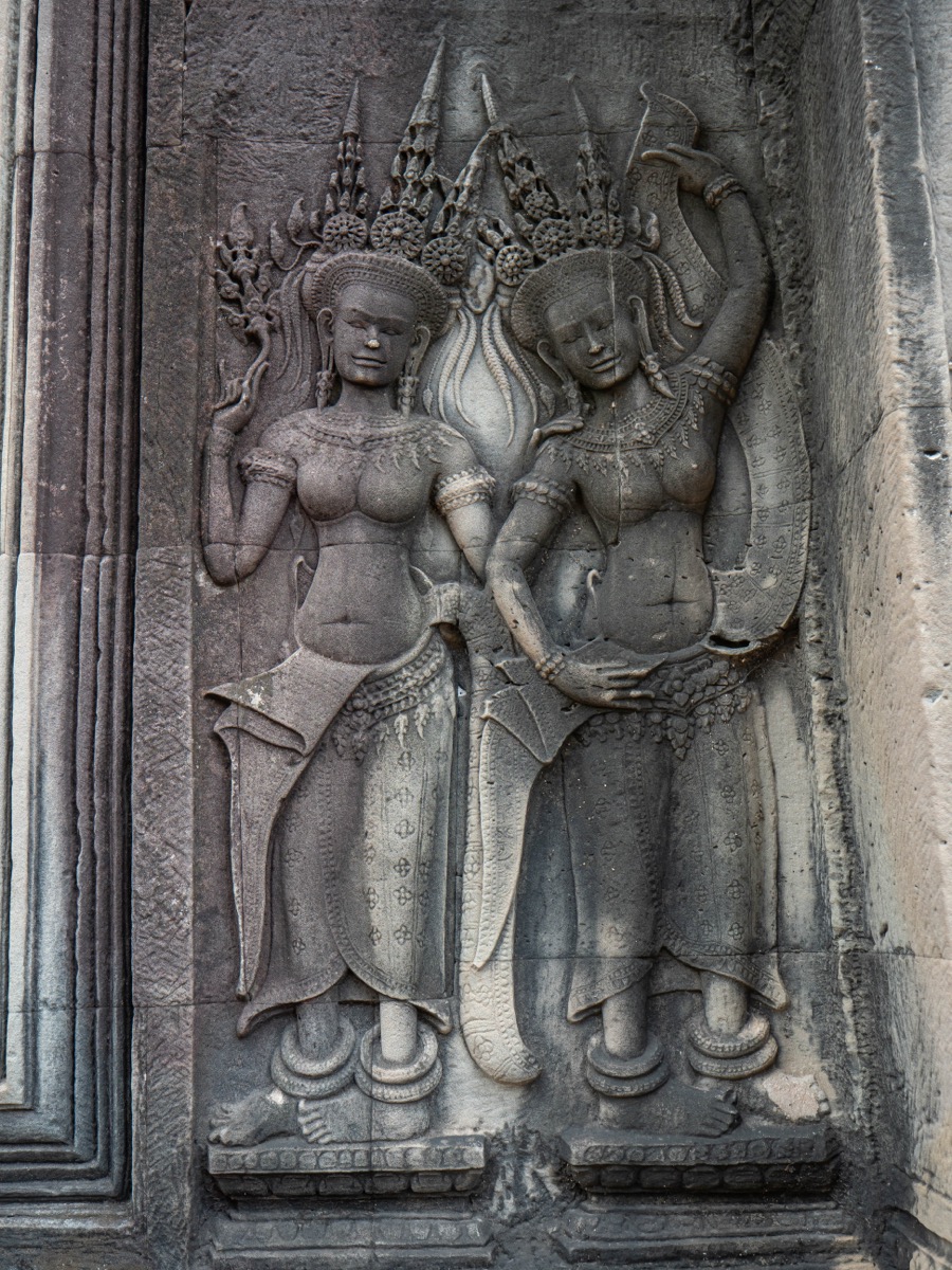 - Apsaras, danseuses célestes finement sculptées, incarnant la grâce divine.