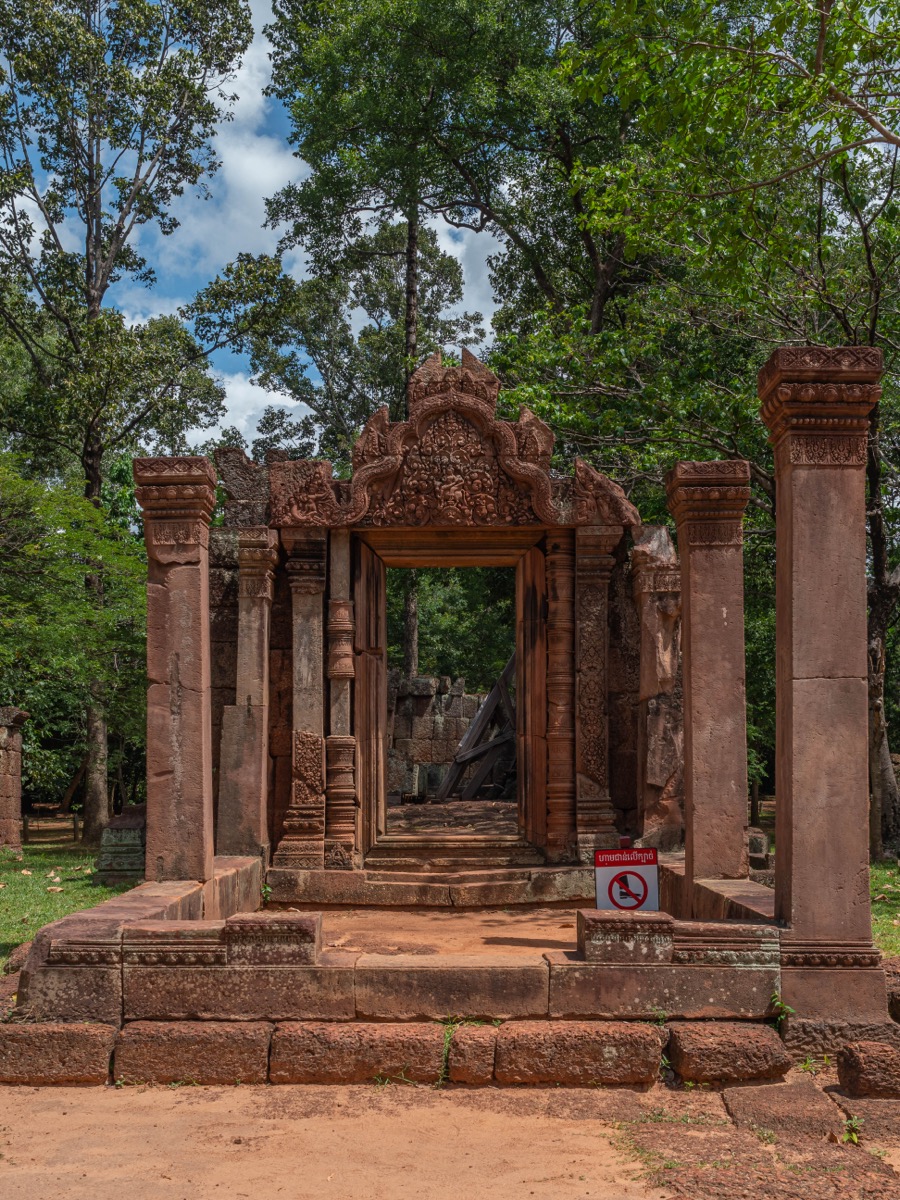Le temple se distingue par l’usage d’un grès rose ou rougeâtre, matériau plus tendre que le grès gris habituel, permettant des sculptures d’une extrême précision. Cette particularité, alliée à des proportions harmonieuses, donne à l’ensemble un aspect délicat et presque miniature.