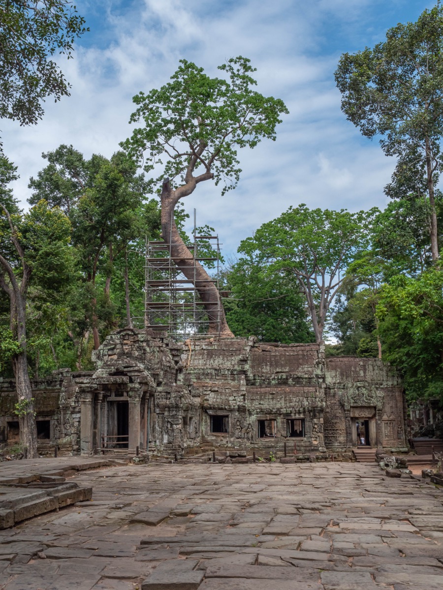 Les racines des arbres s’entrelacent avec les pierres du temple, créant un paysage pittoresque et mystique. Le temple a été délibérément laissé partiellement en l’état pour conserver son ambiance originale.