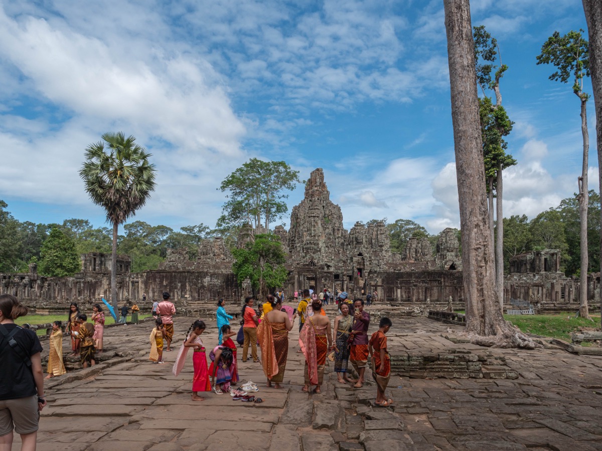 On peut y voir des Cambodgiens en tenue traditionnelle pour les prises de photos devant l’entrée du temple du Bayon. Les tenues peuvent être louées dans des stands en bord de route.