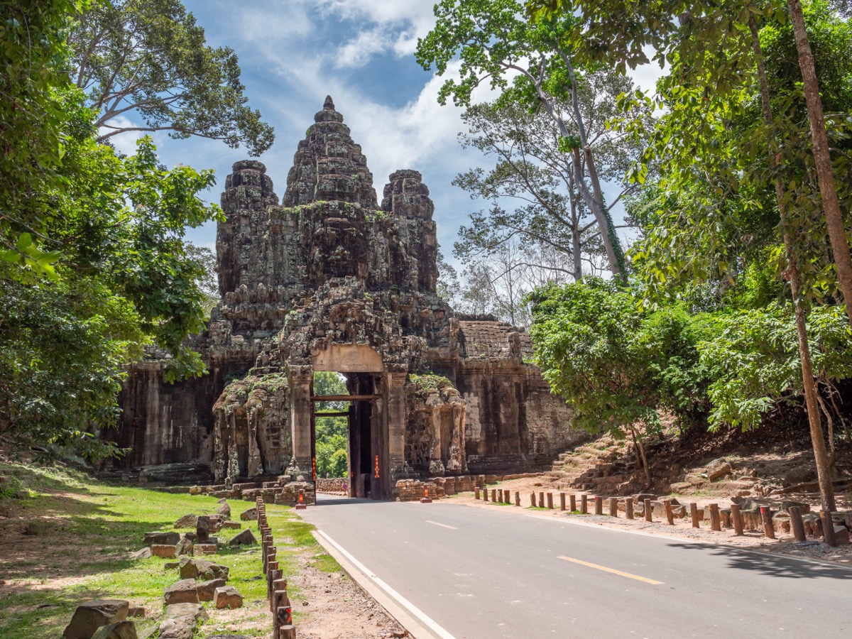 En franchissant cette imposante porte, les visiteurs pénètrent dans l’enceinte d’Angkor Thom, une cité fortifiée qui abrite d’autres trésors architecturaux, tels que le célèbre temple du Bayon, avec ses innombrables visages sculptés.
