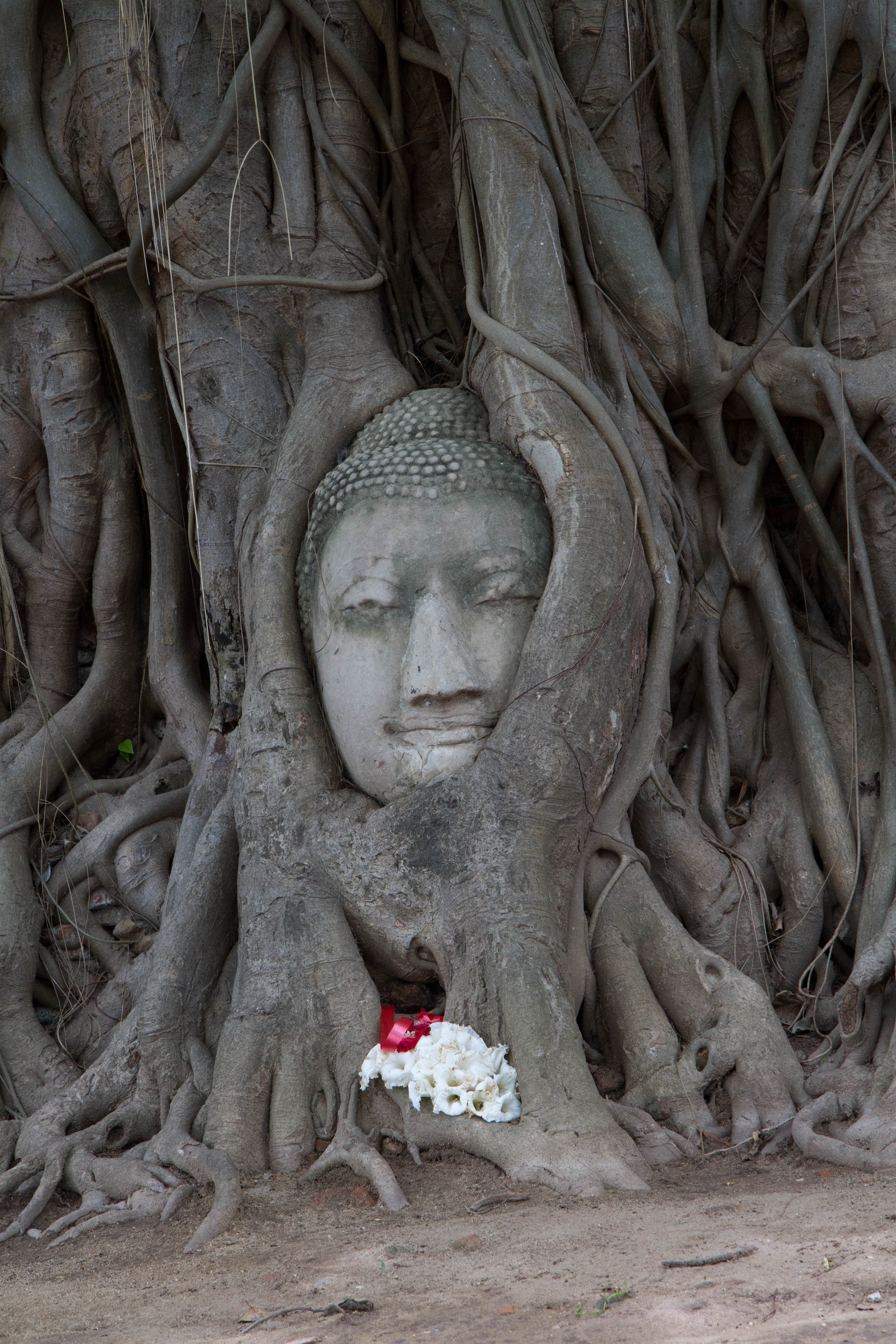 On y trouve également la tête d’un Bouddha incrustée dans les racines d’un banyan.