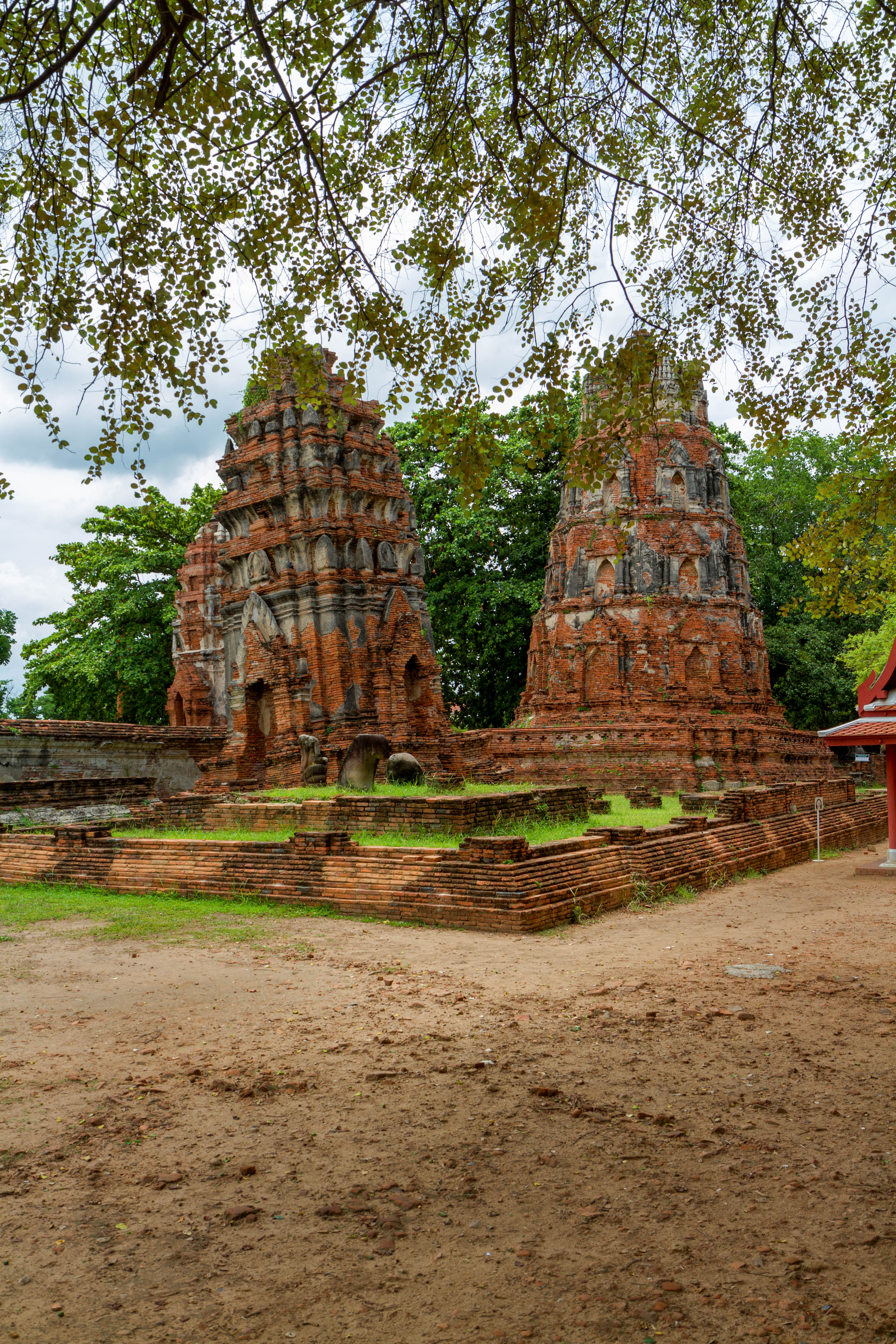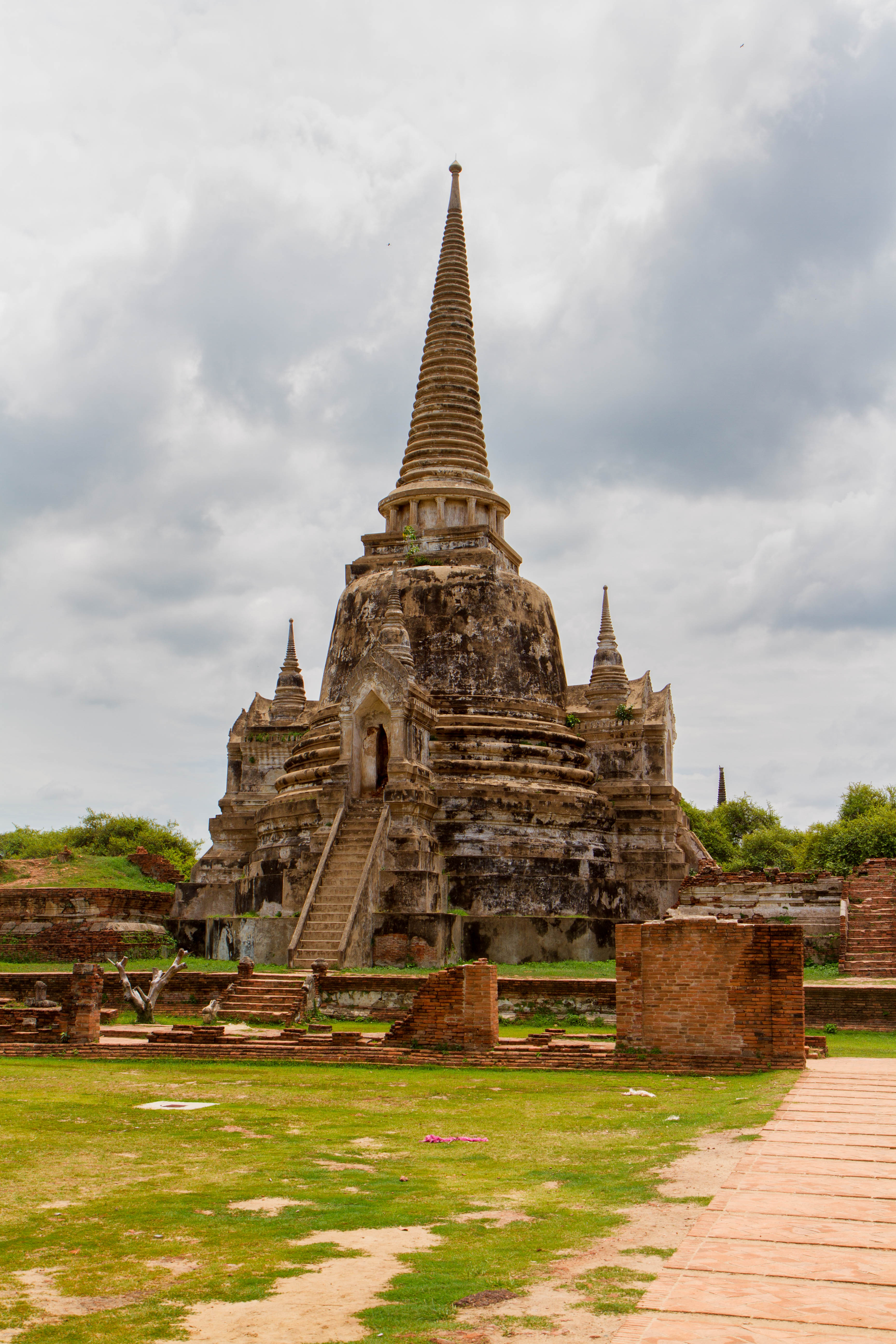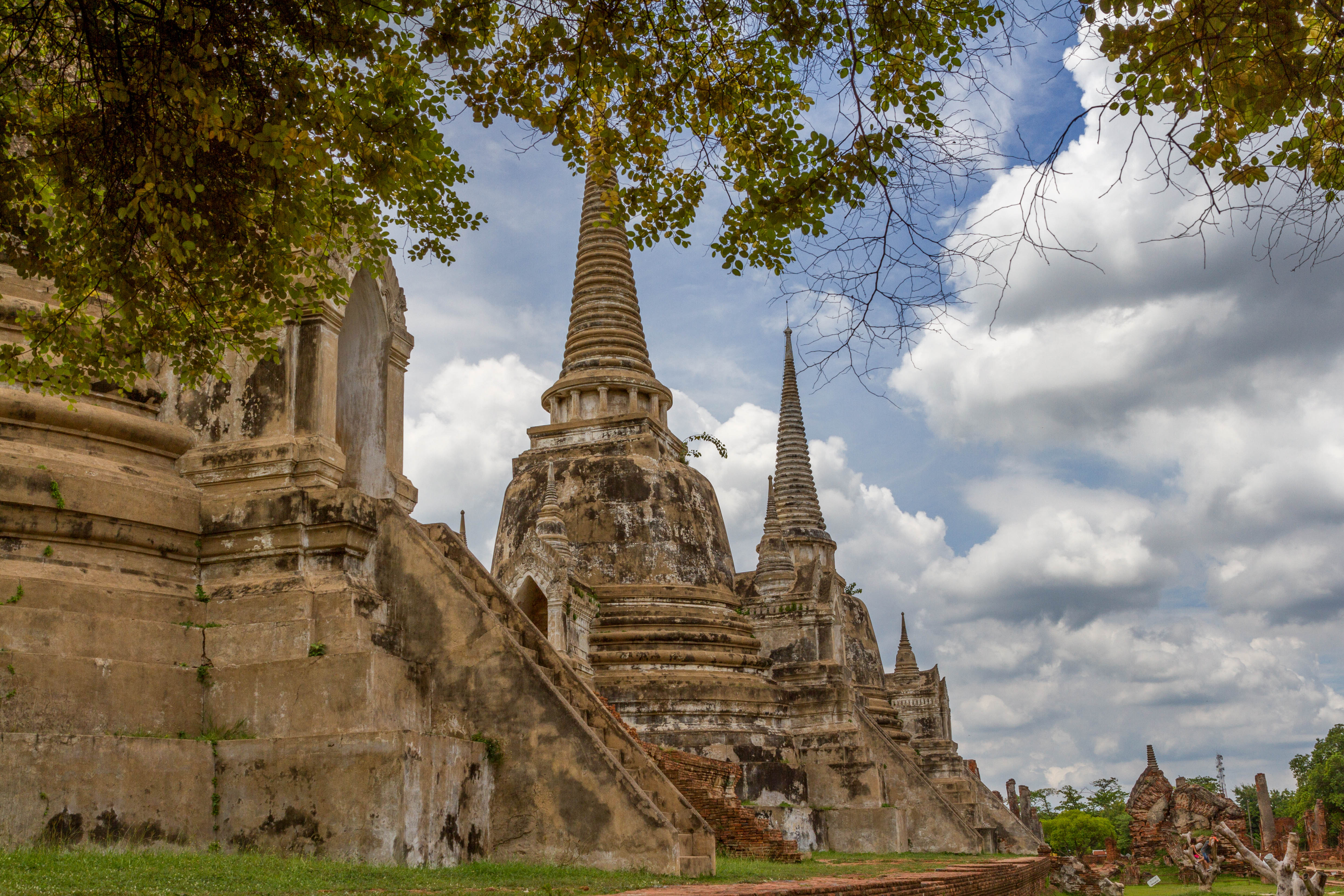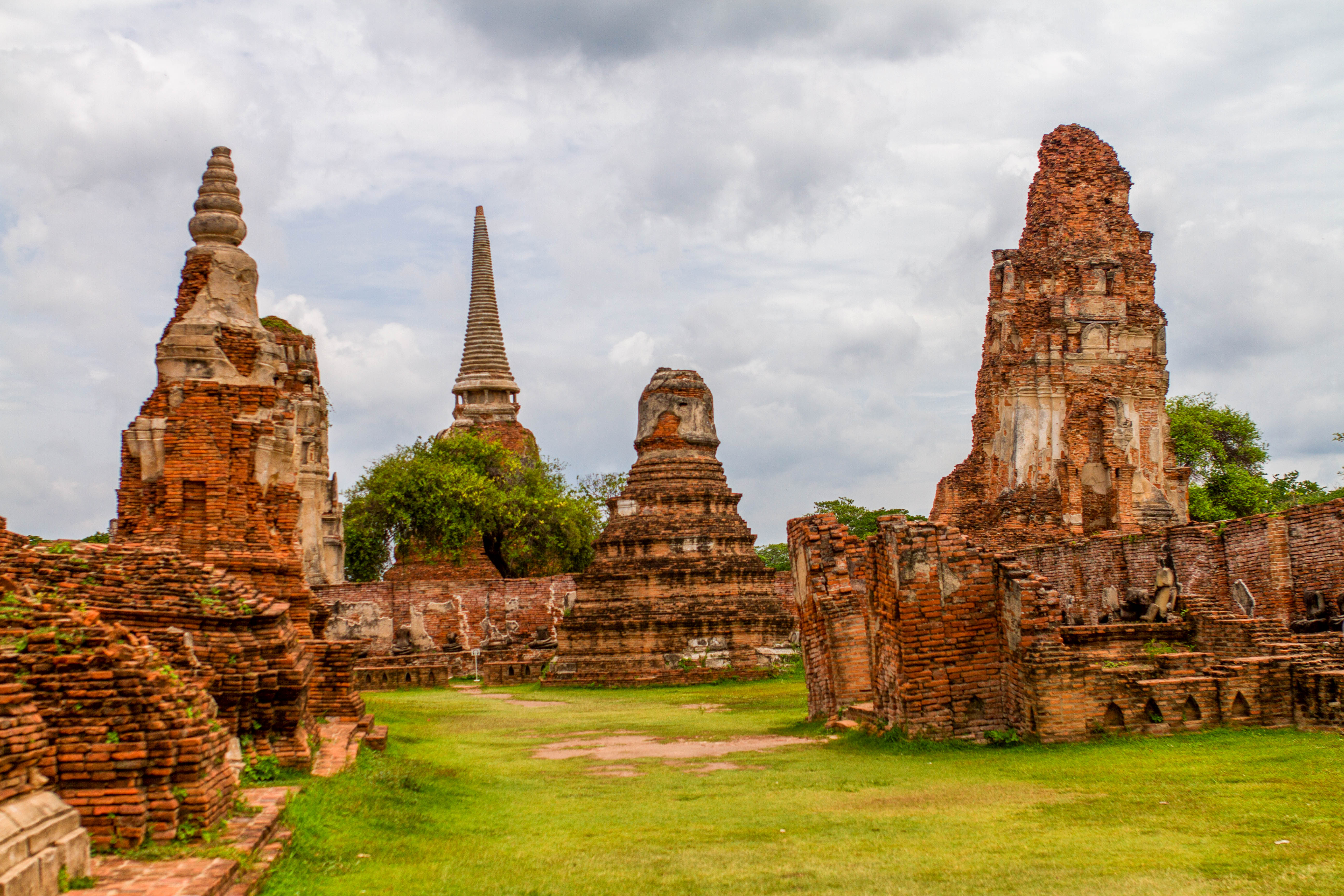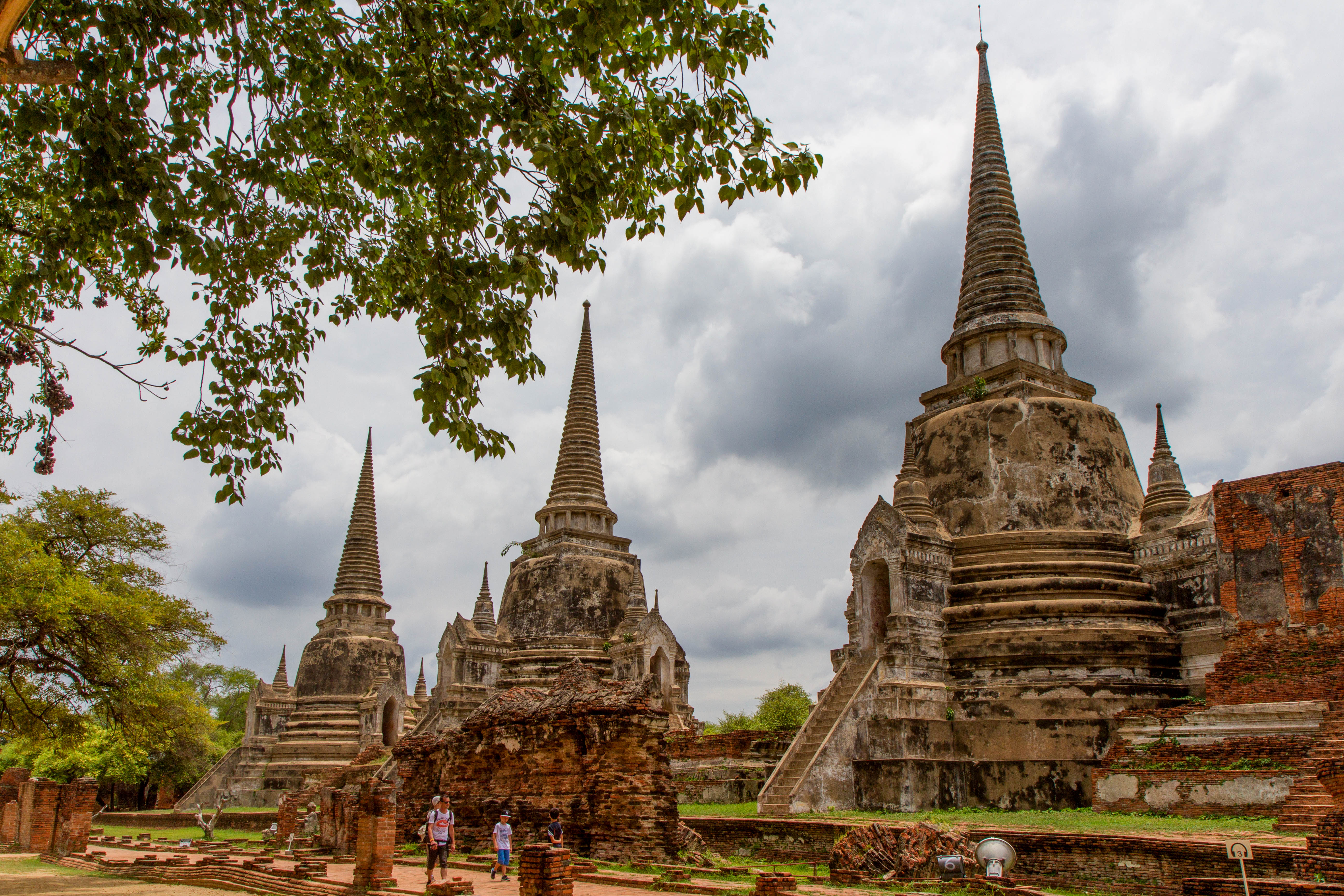 Les chedis emblématiques de Wat Phra Si Sanphet, vestiges du palais royal d’Ayutthaya, au cœur de l’ancienne capitale du royaume de SiamPerspective encadrée sur les stupas de Wat Phra Si Sanphet, autrefois temple royalSous un ciel chargé, les chedis du Wat Phra Si Sanphet dominent les ruines de l’ancienne cité royale d’AyutthayaDétail architectural d’un chedi du Wat Phra Si Sanphet, témoin de la grandeur passée de la capitale du royaume d’AyutthayaLe chedi principal de Wat Phra Si Sanphet, majestueux vestige de l’époque royale d’Ayutthaya, se dresse face aux visiteurs malgré l’usure du tempsRuines et chedis secondaires près de Wat Phra Mongkhon Bophit, offrant un contraste entre vestiges anciens et temples toujours en activitéJeunes visiteurs explorant les escaliers raides d’un des chedis de Wat Phra Si Sanphet, mêlant curiosité enfantine et patrimoine historiquePerspective arborée sur les chedis de Wat Phra Si Sanphet, emblèmes silencieux de la grandeur passée d’Ayutthaya