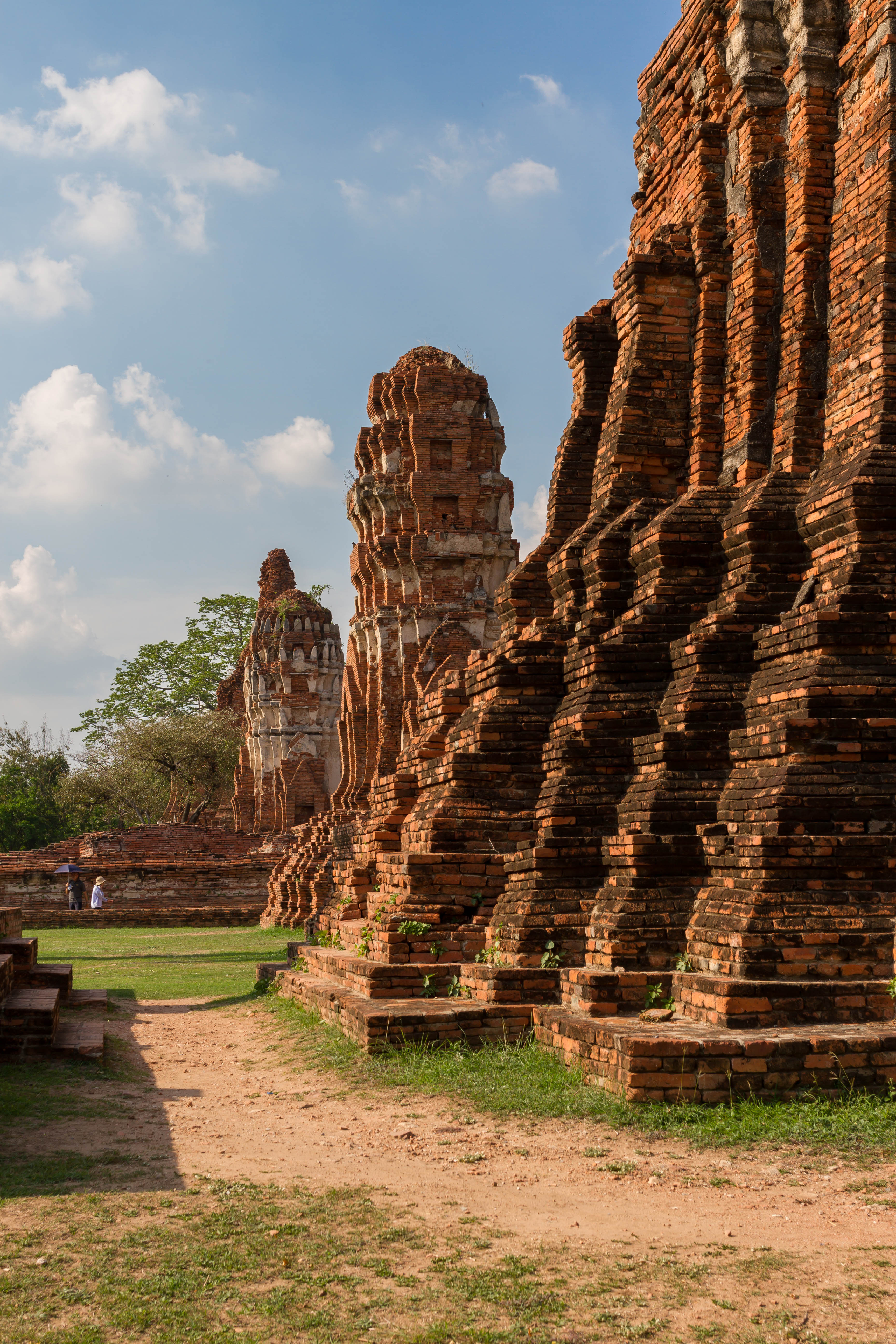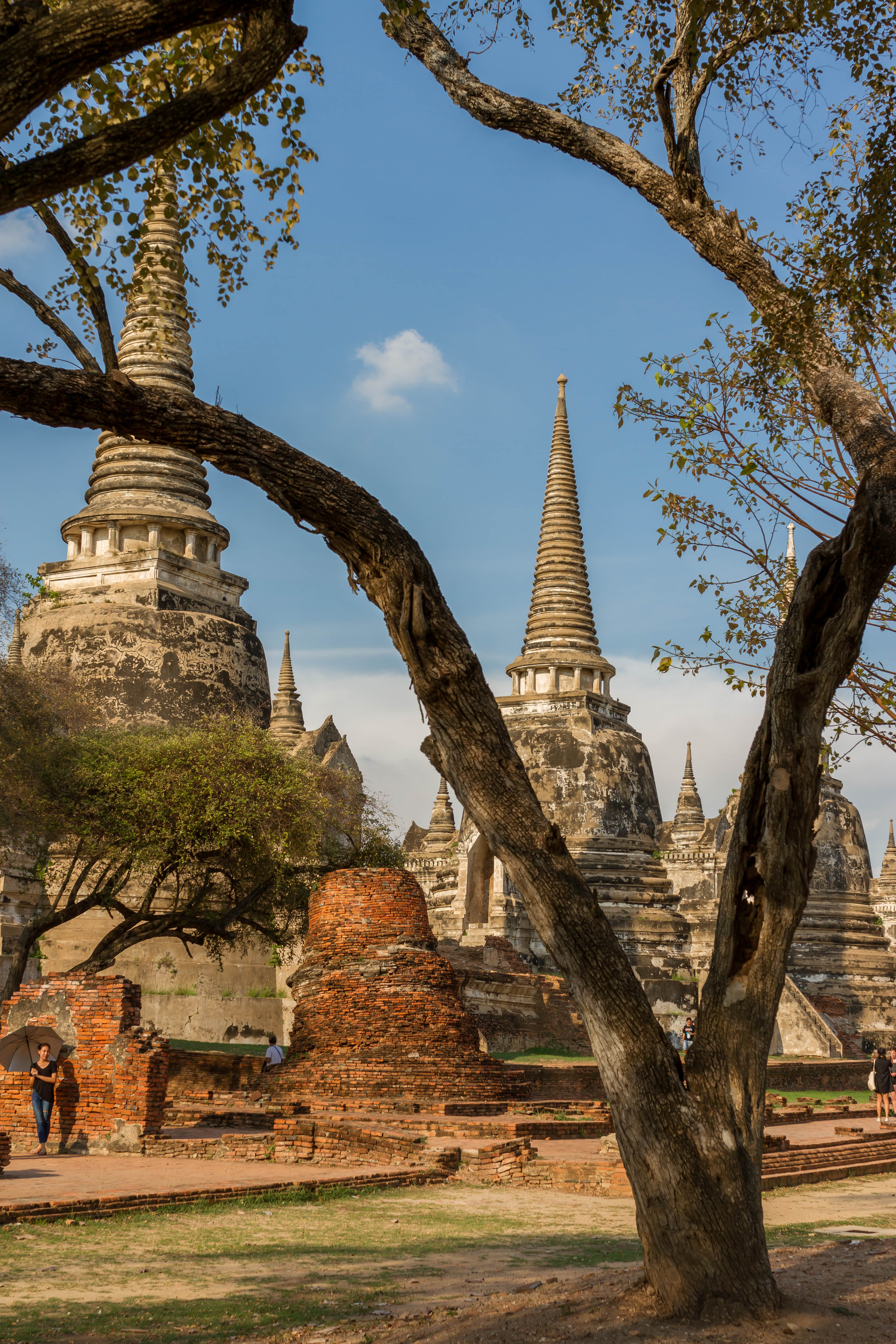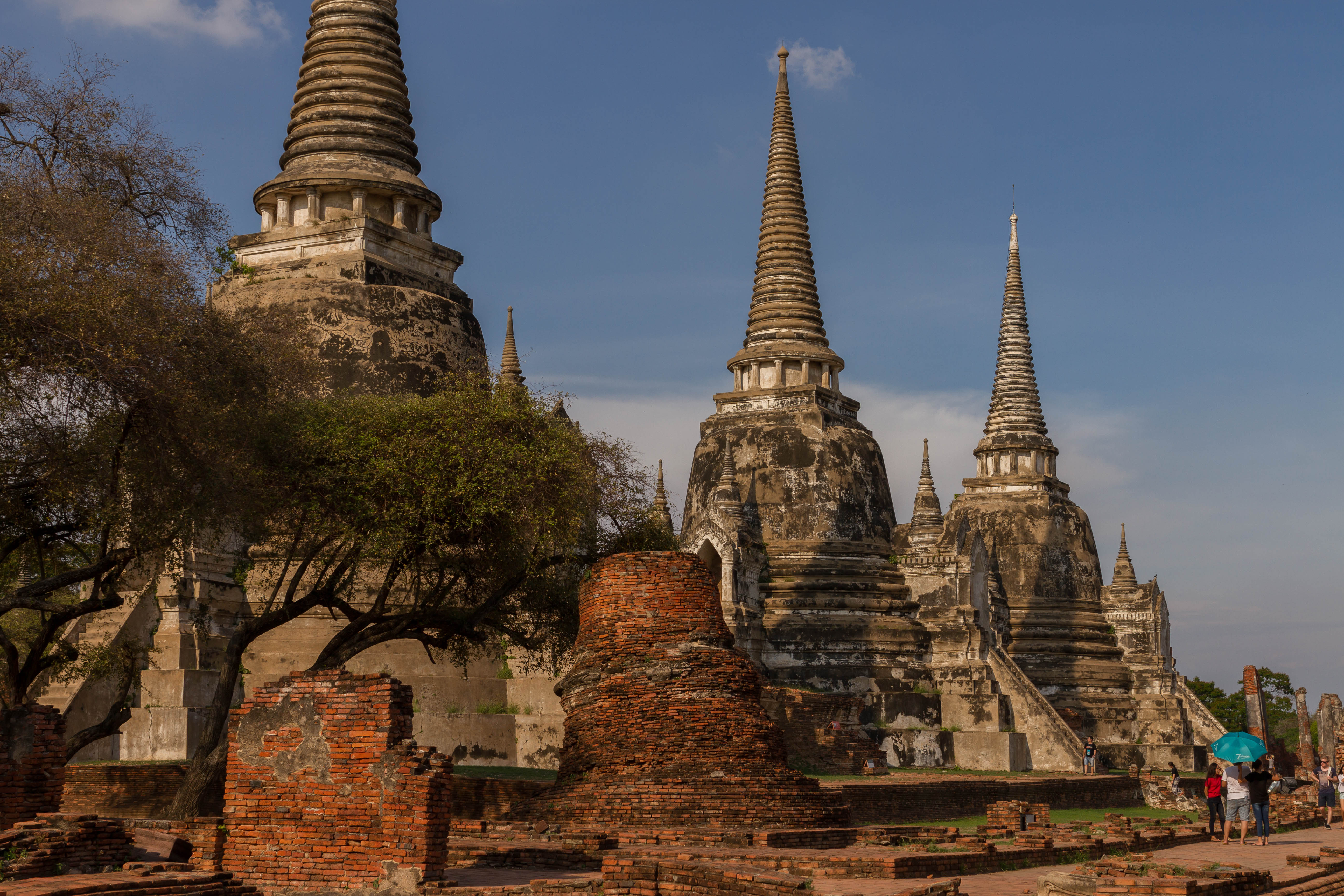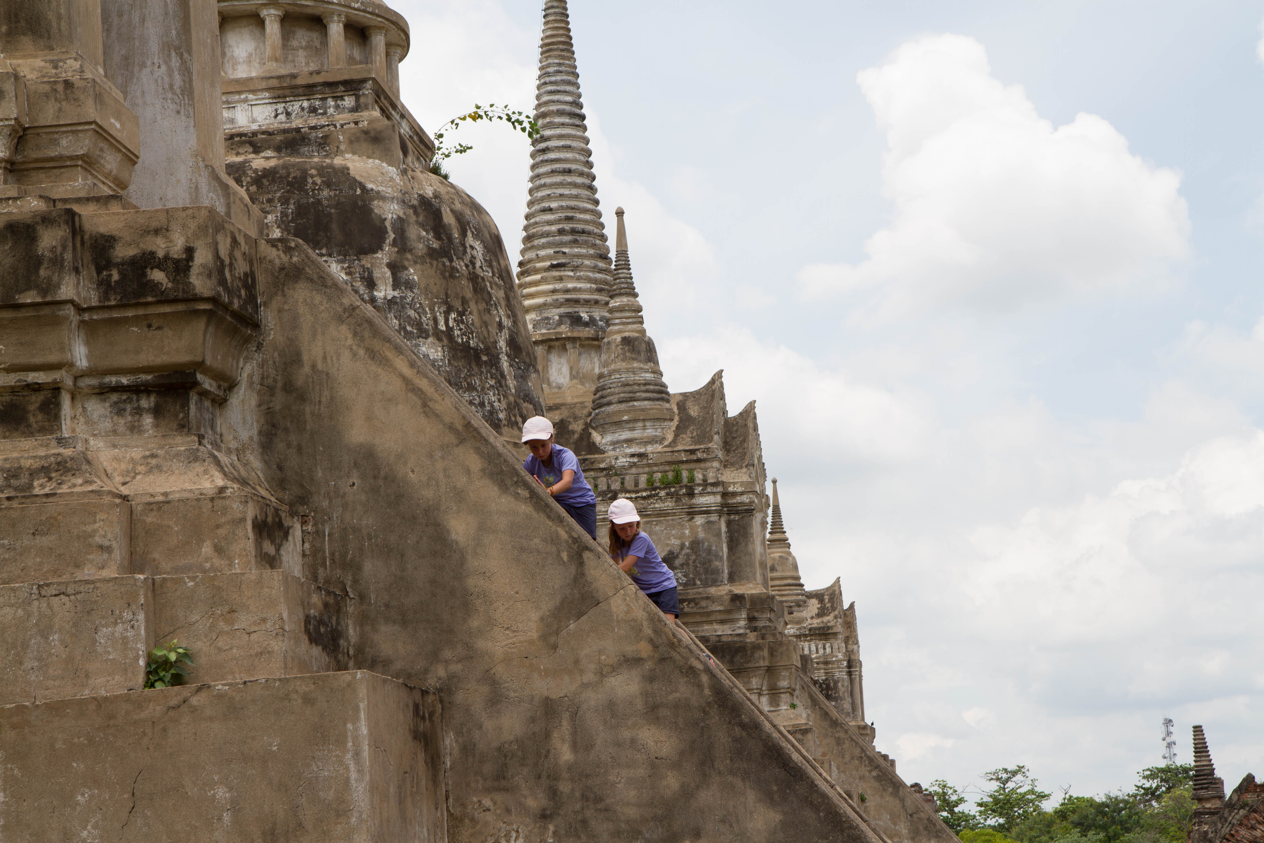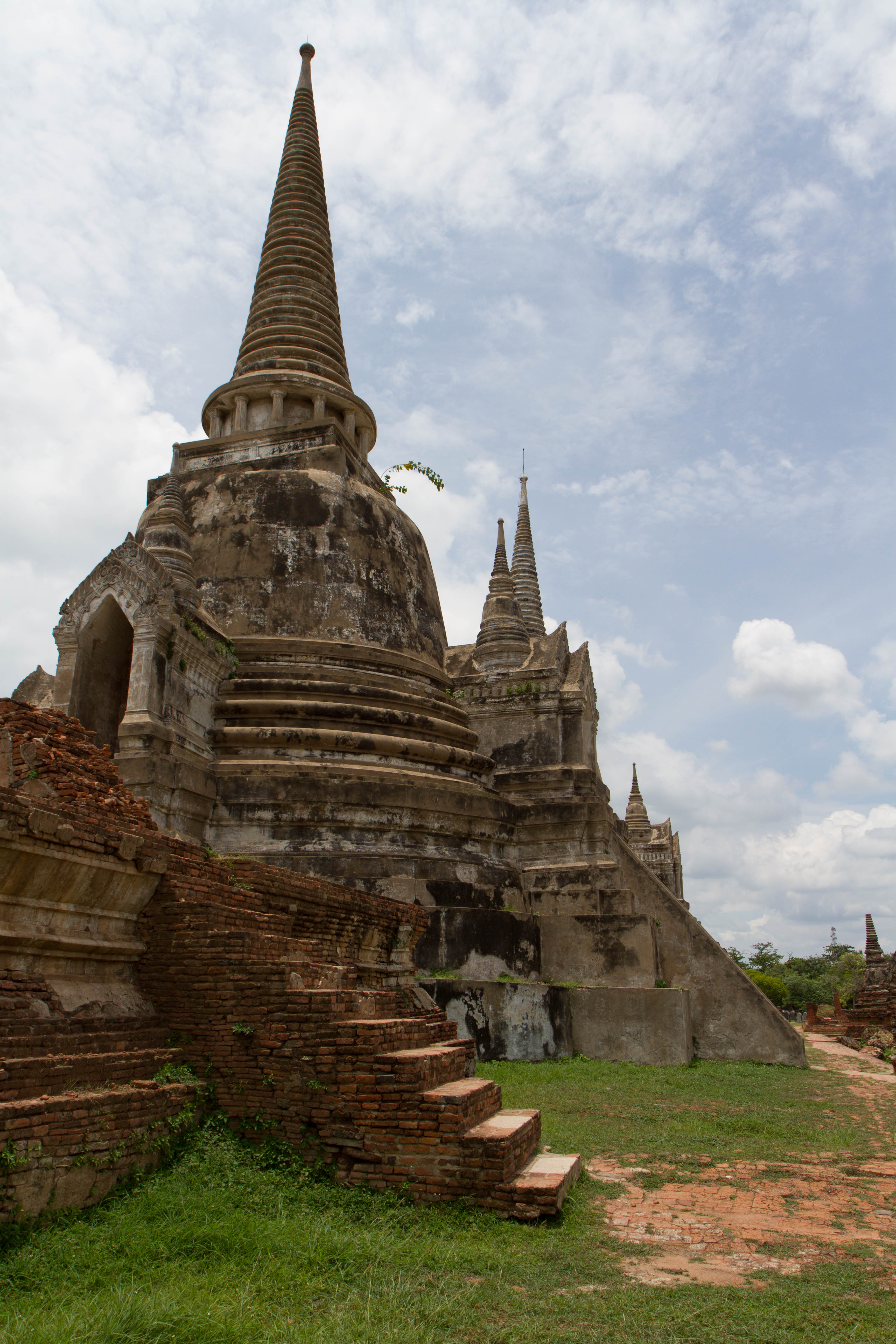 Les chedis emblématiques de Wat Phra Si Sanphet, vestiges du palais royal d’Ayutthaya, au cœur de l’ancienne capitale du royaume de SiamPerspective encadrée sur les stupas de Wat Phra Si Sanphet, autrefois temple royalSous un ciel chargé, les chedis du Wat Phra Si Sanphet dominent les ruines de l’ancienne cité royale d’AyutthayaDétail architectural d’un chedi du Wat Phra Si Sanphet, témoin de la grandeur passée de la capitale du royaume d’AyutthayaLe chedi principal de Wat Phra Si Sanphet, majestueux vestige de l’époque royale d’Ayutthaya, se dresse face aux visiteurs malgré l’usure du tempsRuines et chedis secondaires près de Wat Phra Mongkhon Bophit, offrant un contraste entre vestiges anciens et temples toujours en activitéJeunes visiteurs explorant les escaliers raides d’un des chedis de Wat Phra Si Sanphet, mêlant curiosité enfantine et patrimoine historiquePerspective arborée sur les chedis de Wat Phra Si Sanphet, emblèmes silencieux de la grandeur passée d’Ayutthaya