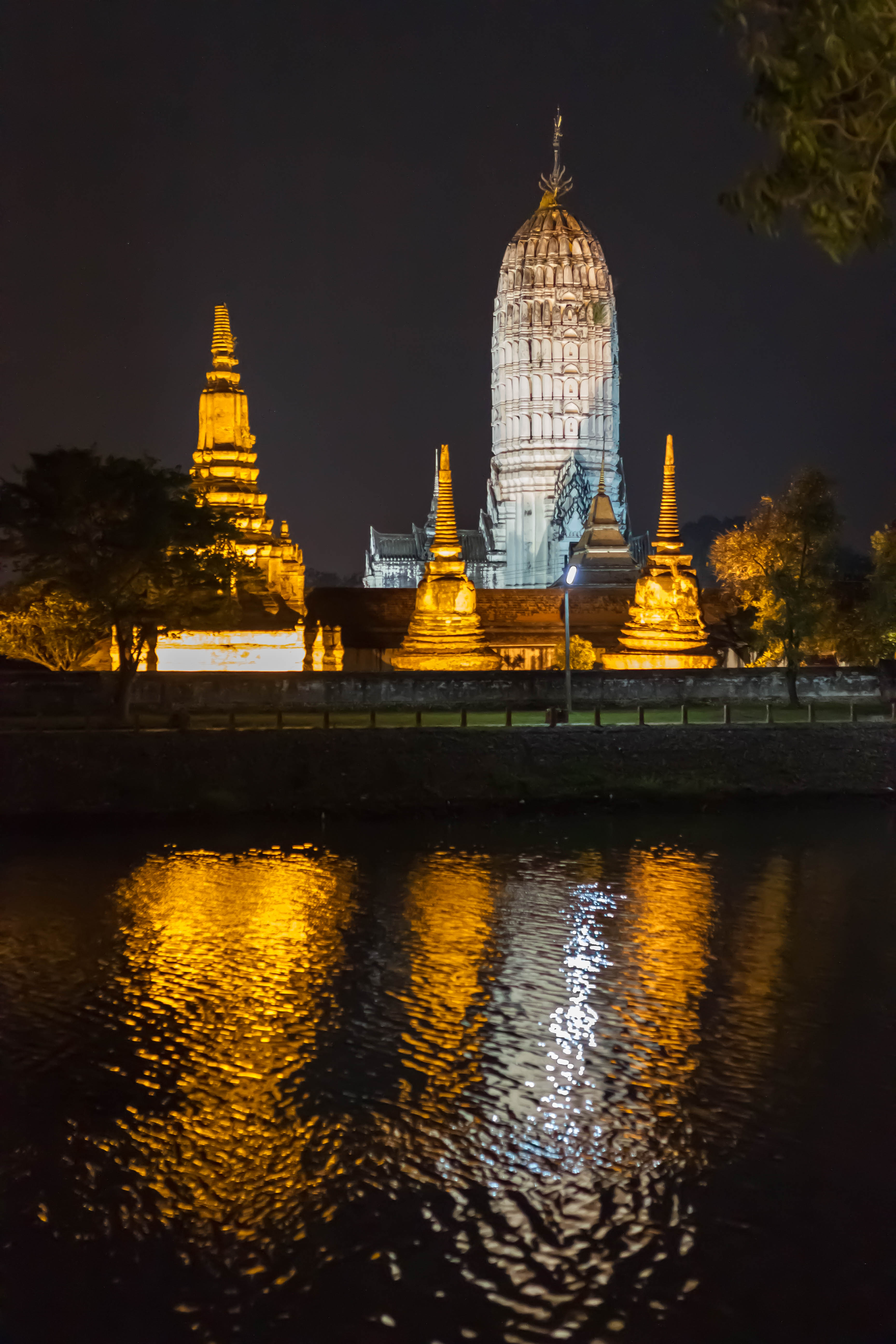 Fin de journée sur les vestiges du Wat Ratchaburana, où les chedis émergent de la végétation, témoignages silencieux de l'ancienne capitale du royaume d’AyutthayaLe Wat Phutthaisawan depuis la rive opposée du fleuve Chao Phraya, un des rares temples encore actifs dans l’enceinte de l’ancienne AyutthayaReflets nocturnes du Wat Phutthaisawan, où les jeux de lumière révèlent la majesté du site sur les rives du Chao Phraya