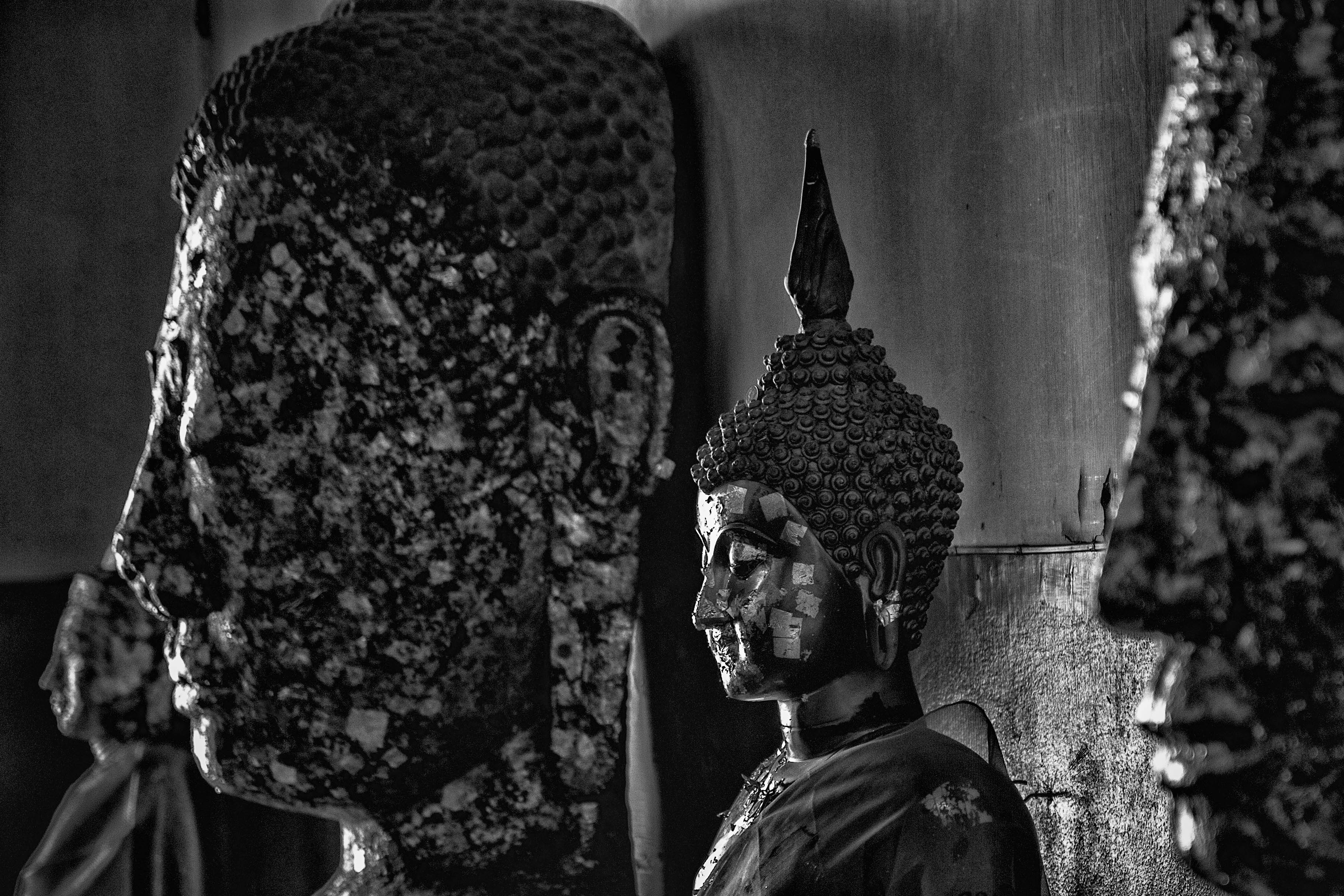 Alignement de statues de Bouddha dans un temple d'Ayutthaya, baignées d’ombre et de lumière. La feuille d’or appliquée par les fidèles témoigne des pratiques de dévotion bouddhiste